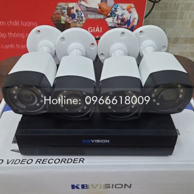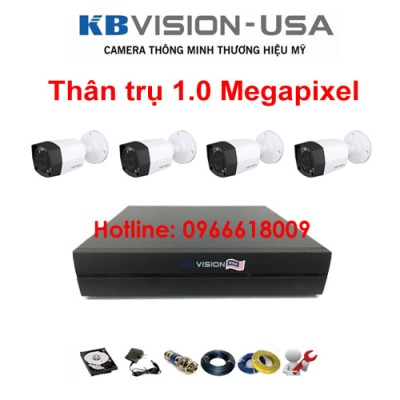 Bộ 4 camera KBVISION thân trụ 1.0 Megapixel gồm có: đầu ghi hình 4 kênh, 4 camera thân trụ 1003c4, ổ cứng lưu trữ dữ liệu, phụ kiện đi kèm